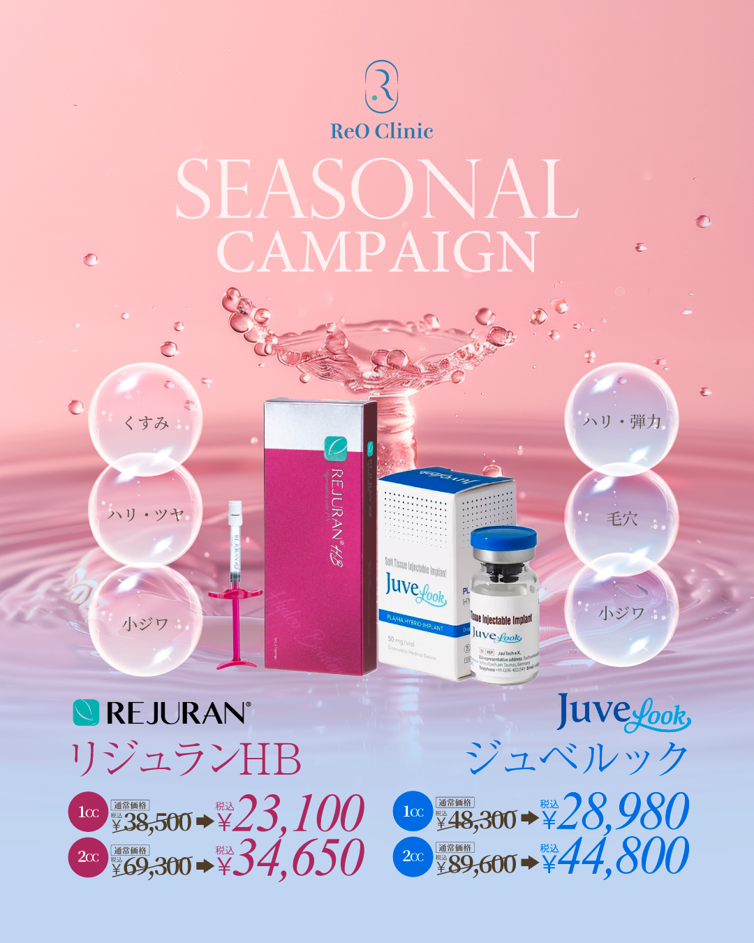 ReO CLINICでは、人気のジュベルック水光注射とリジュランHB水光注射を、10月〜12月の期間限定で特別価格にてご案内いたします。